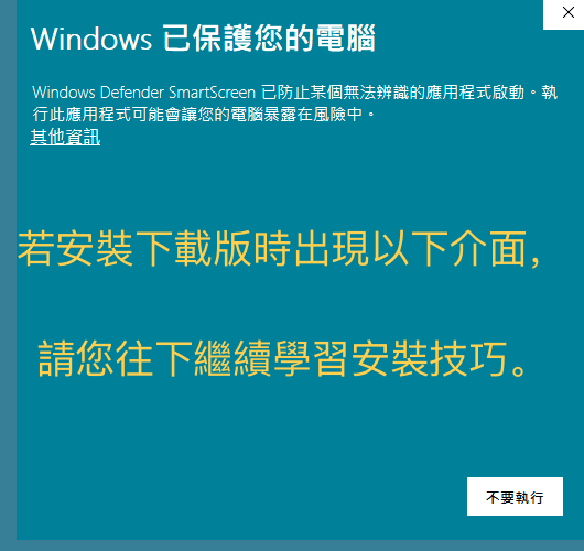 若安裝Windows下載版安裝時出現以下畫面,請繼續向下瀏覽,正確安裝軟體。